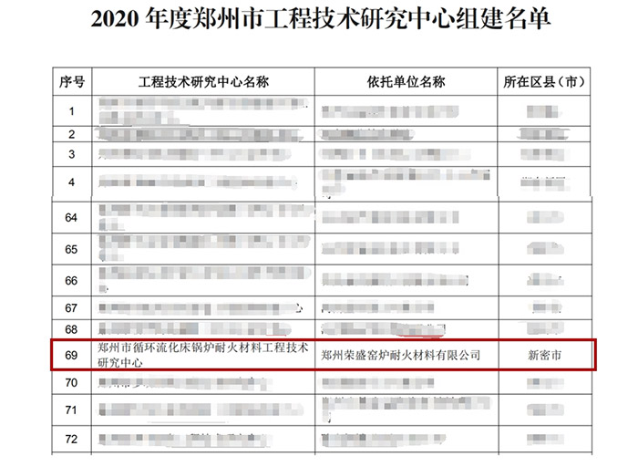 經(jīng)河南省鄭州市科學技術(shù)局批準,在鄭州榮盛窯爐耐火材料有限公司成立循環(huán)流化床鍋爐耐火材料工程技術(shù)研究中心,該中心是繼神華集團和國神集團之后成立的CFB技術(shù)研發(fā)和耐材應(yīng)用中心。